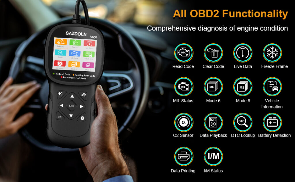 The V550 OBD2 Scanner is a plug-and-play diagnostic tool for most 1996+ gasoline vehicles, offering over 40,000 DTC definitions, real-time live data, freeze-frame capture, O2 sensor tests, EVAP analysis, Mode 6/8 misfire checks, I/M readiness, VIN/CVN retrieval, and battery voltage testing. Its 2.8-inch RGB LCD displays up to four data streams in numeric or graph form. It runs directly from the vehicle, so it doesn’t need batteries. It also generates PC reports and comes with lifetime updates. Plus, you get 24/7 support and a 60-day return policy. Not compatible with hybrids/EVs; broad protocol support includes CAN, KWP2000, ISO9141, and J1850.